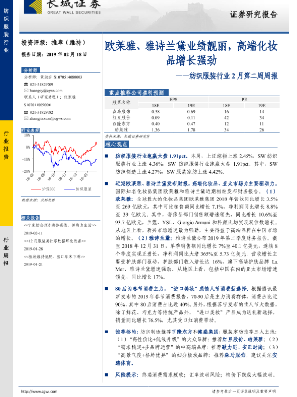 【长城证券】【20190218】20190218-长城证券-纺织服装行业2月第二周周报:欧莱雅、雅诗兰黛业绩靓丽,高端化妆品增长强劲-21页