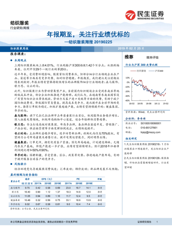 【民生证券】【20190225】20190225-民生证券-纺织服装周报:年报期至,关注行业绩优标的-11页