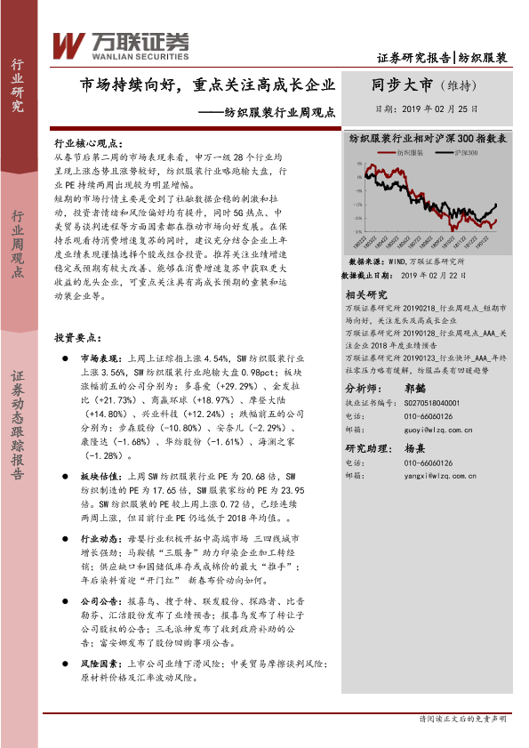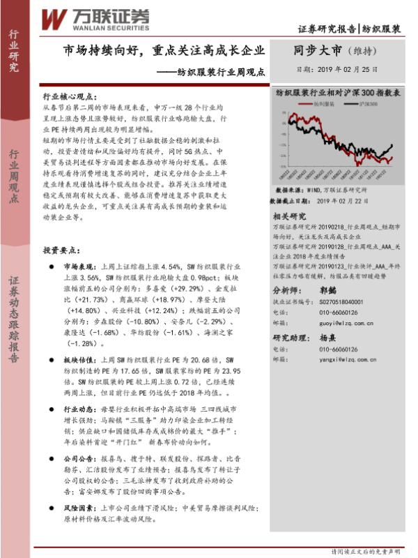 【万联证券】【20190225】20190225-万联证券-纺织服装行业周观点:市场持续向好,重点关注高成长企业-11页