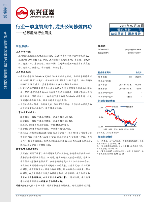 【东兴证券】【20190225】纺织服装行业周报:行业一季度筑底中,龙头公司修炼内功-12页