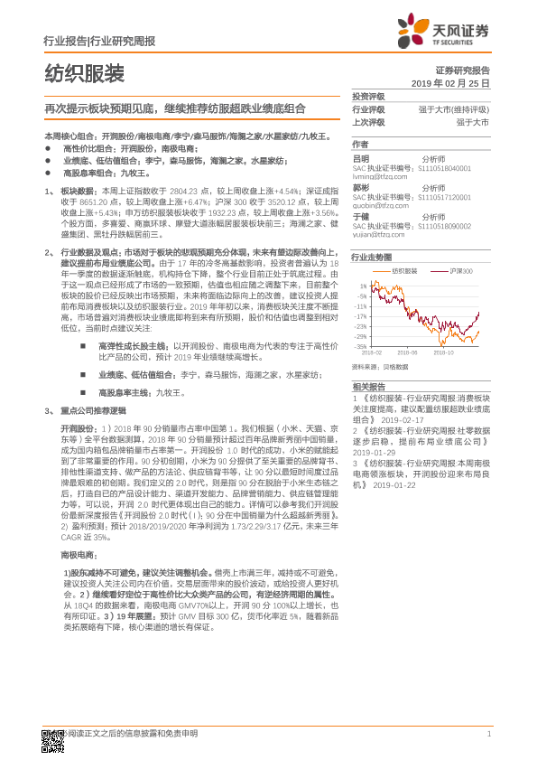 【天风证券】【20190225】20190225-天风证券-纺织服装行业研究周报:再次提示板块预期见底,继续推荐纺服超跌业绩底组合-16页