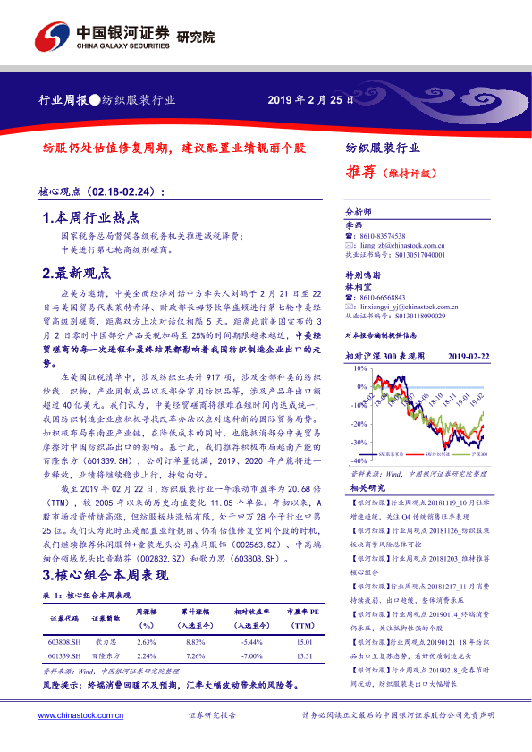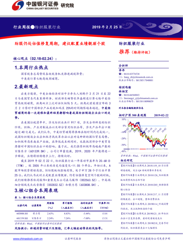 【银河证券】【20190225】20190225-中国银河-纺织服装行业周报:纺服仍处估值修复周期,建议配置业绩靓丽个股-23页
