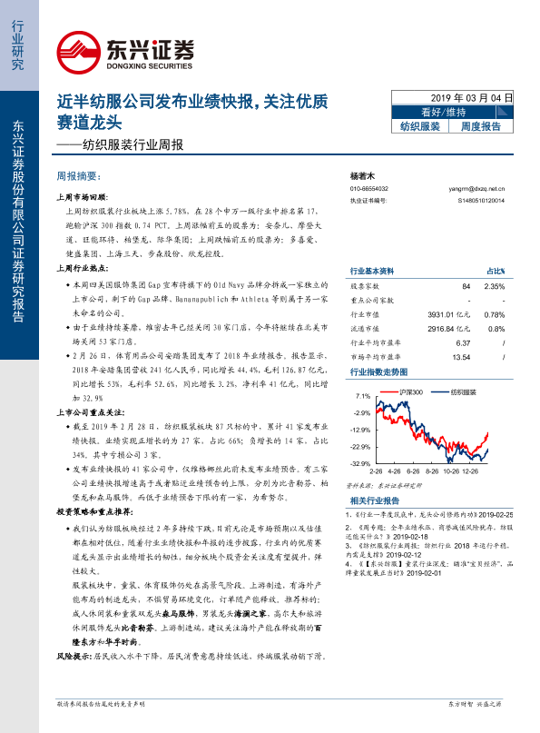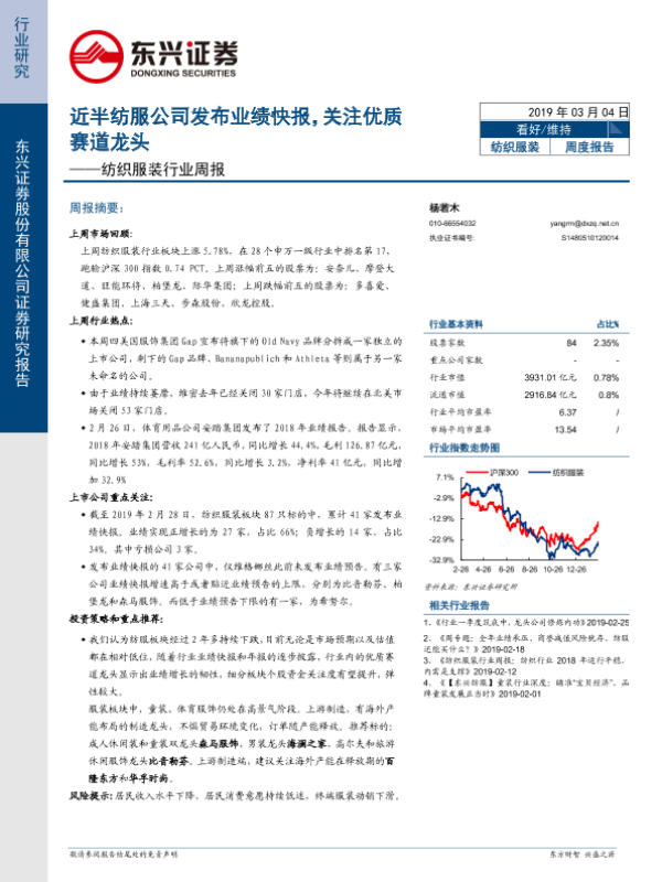 【东兴证券】【20190304】20190304-东兴证券-纺织服装行业周报:近半纺服公司发布业绩快报,关注优质赛道龙头-14页