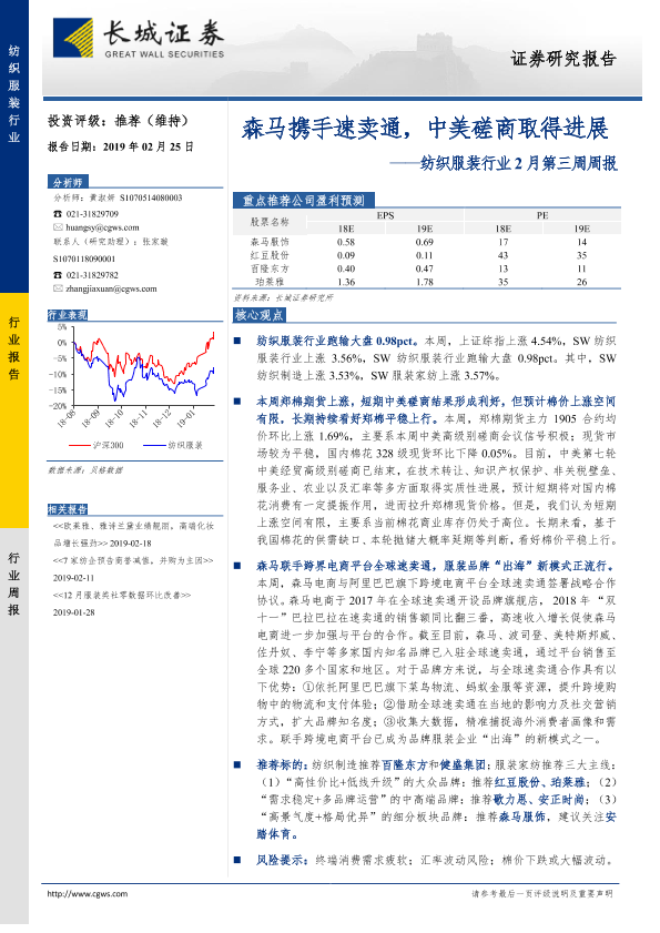 【长城证券】【20190225】20190225-长城证券-纺织服装行业2月第三周周报:森马携手速卖通,中美磋商取得进展-21页