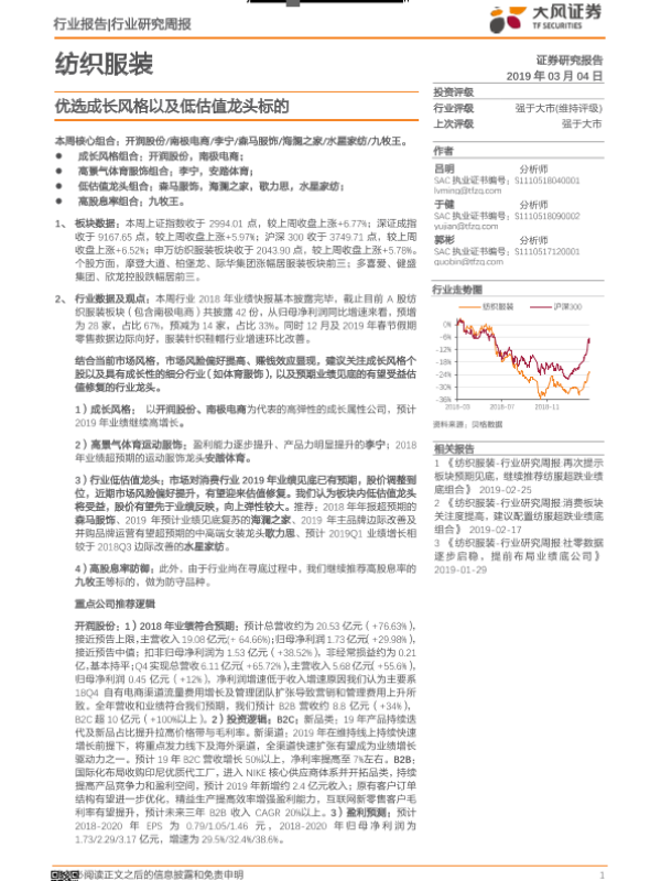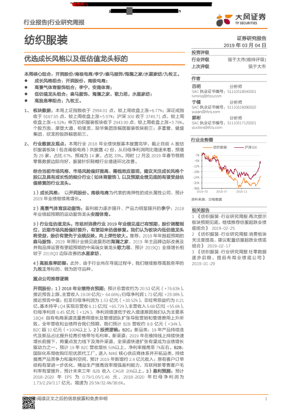 【天风证券】【20190304】20190304-天风证券-纺织服装行业研究周报:优选成长风格以及低估值龙头标的-18页
