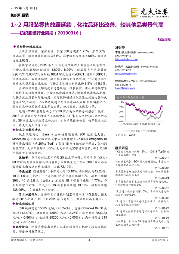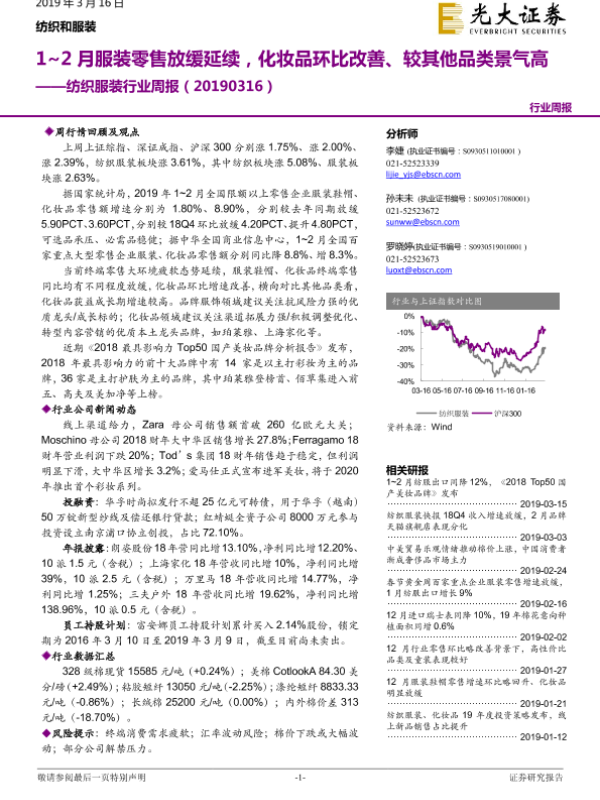 【光大证券】【20190316】20190316-光大证券-纺织服装行业周报:1~2月服装零售放缓延续,化妆品环比改善、较其他品类景气高-18页