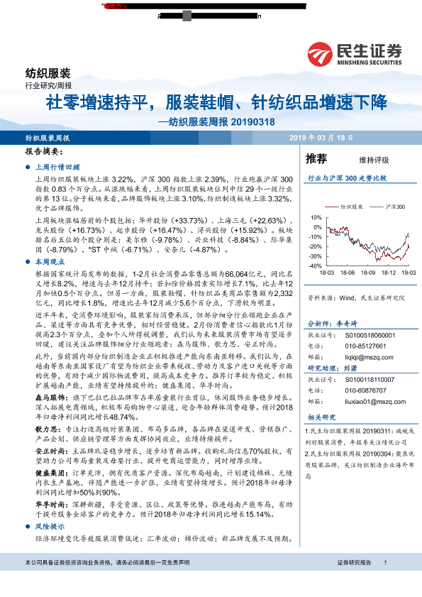 【民生证券】【20190318】20190318-民生证券-纺织服装周报:社零增速持平,服装鞋帽、针纺织品增速下降-11页