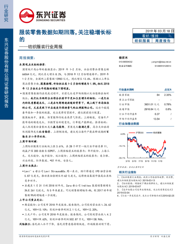 【东兴证券】【20190318】20190318-东兴证券-纺织服装行业周报:服装零售数据如期回落,关注稳增长标的-14页