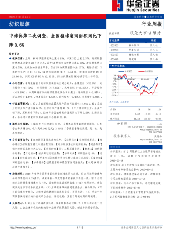 【华金证券】【20190324】纺织服装行业周报:中棉协第二次调查,全国植棉意向面积同比下降3.6%-16页
