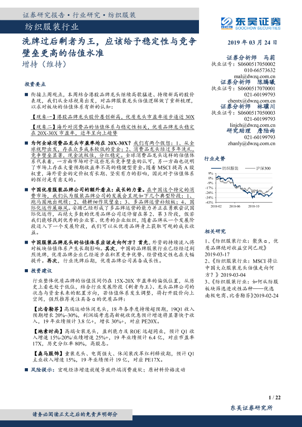 【东吴证券】【20190324】20190324-东吴证券-纺织服装行业研究:洗牌过后剩者为王,应该给予稳定性与竞争壁垒更高的估值水准-22页