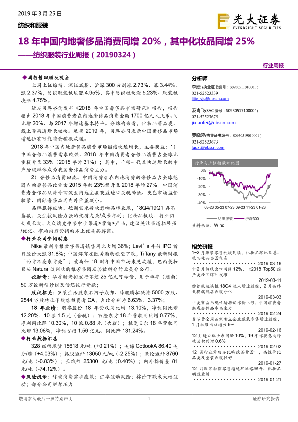 【光大证券】【20190325】20190325-光大证券-纺织服装行业周报:18年中国内地奢侈品消费同增20%,其中化妆品同增25%-18页