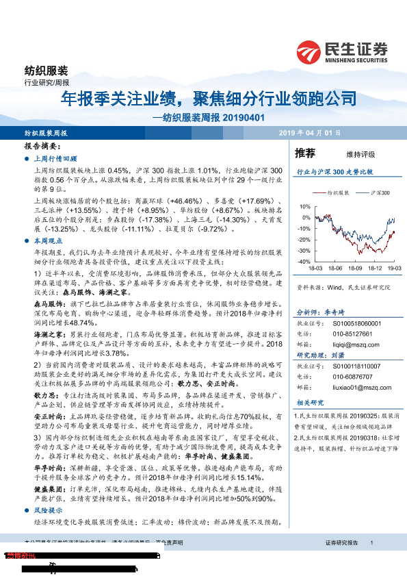 【民生证券】【20190401】20190401-民生证券-纺织服装周报:年报季关注业绩,聚焦细分行业领跑公司-11页