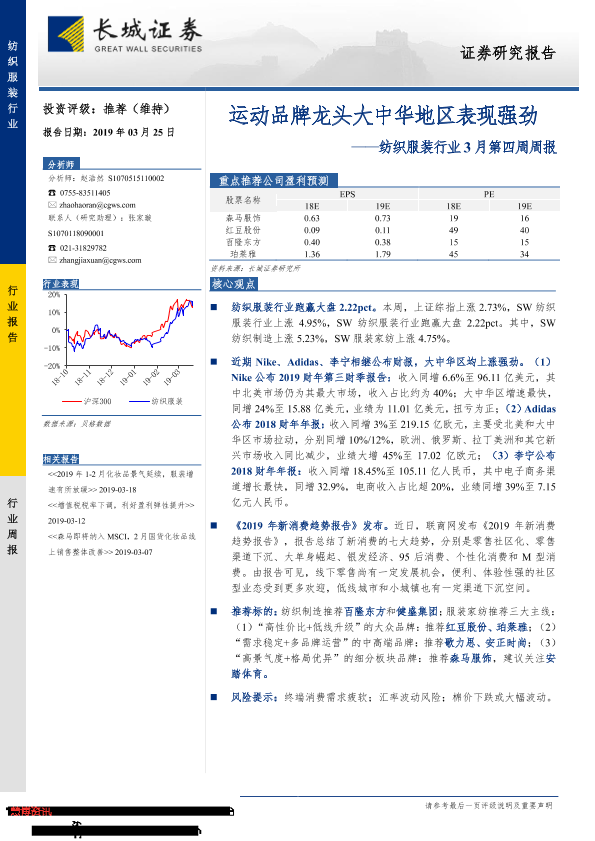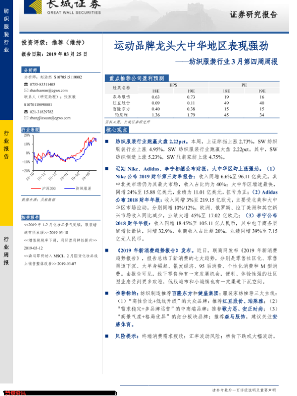 【长城证券】【20190325】20190325-长城证券-纺织服装行业3月第四周周报:运动品牌龙头大中华地区表现强劲-22页