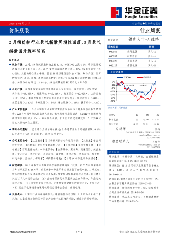 【华金证券】【20190407】20190407-华金证券-纺织服装行业周报:2月棉纺织行业景气指数周期性回落,3月景气指数回升概率较高-18页