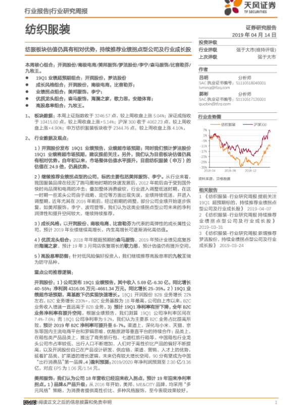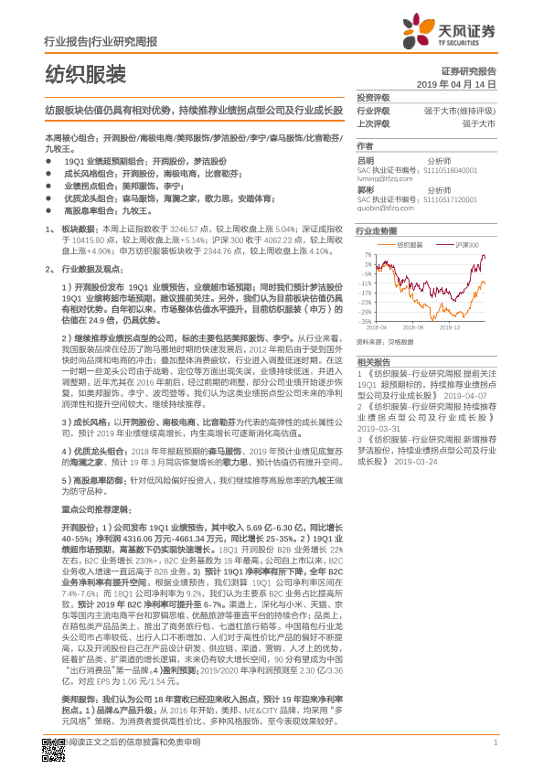 【天风证券】【20190414】20190414-天风证券-纺织服装行业研究周报:纺服板块估值仍具有相对优势,持续推荐业绩拐点型公司及行业成长股-19页