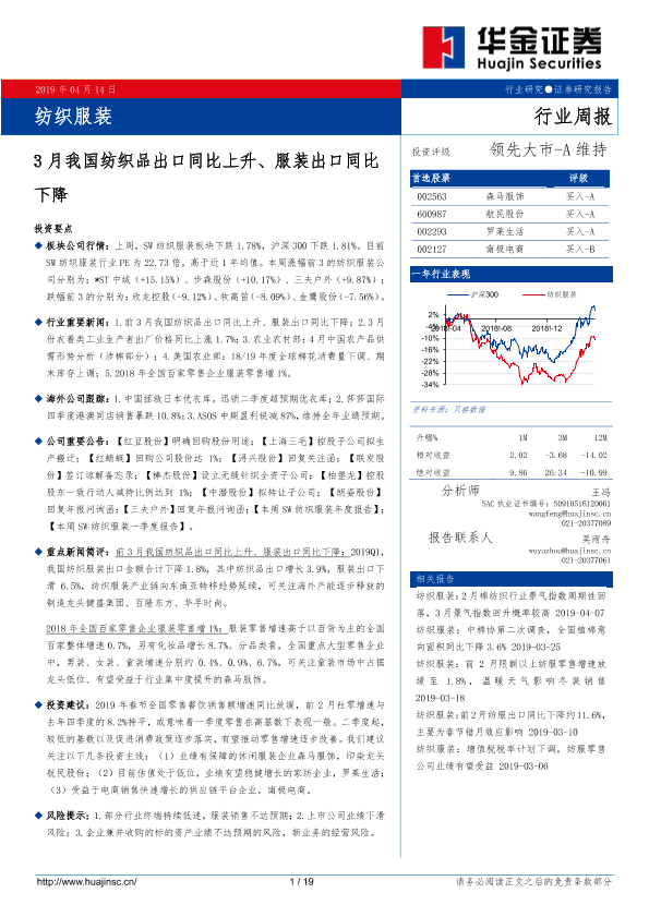 【华金证券】【20190414】20190414-华金证券-纺织服装行业周报:3月我国纺织品出口同比上升、服装出口同比下降-19页