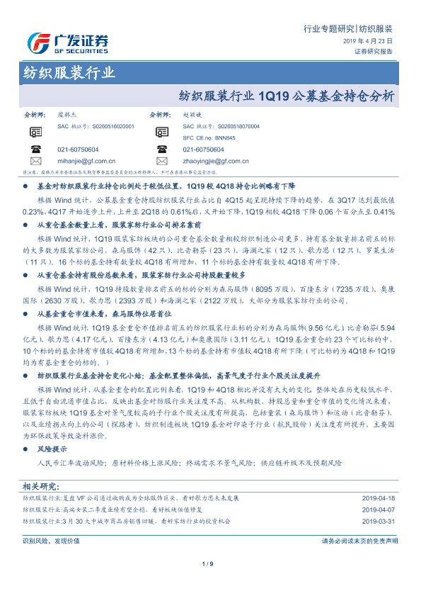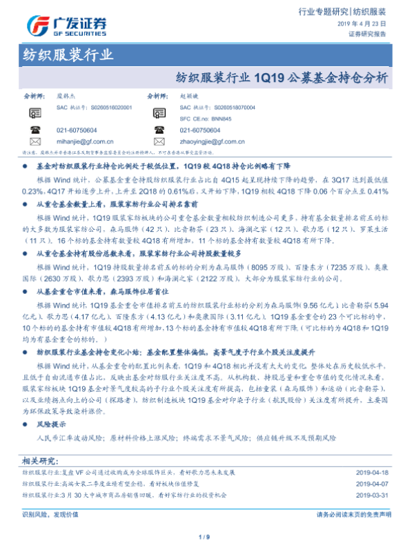 【广发证券】【20190423】纺织服装行业1Q19公募基金持仓分析-9页