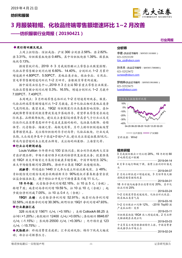 【光大证券】【20190421】20190421-光大证券-纺织服装行业周报:3月服装鞋帽、化妆品终端零售额增速环比1~2月改善-21页