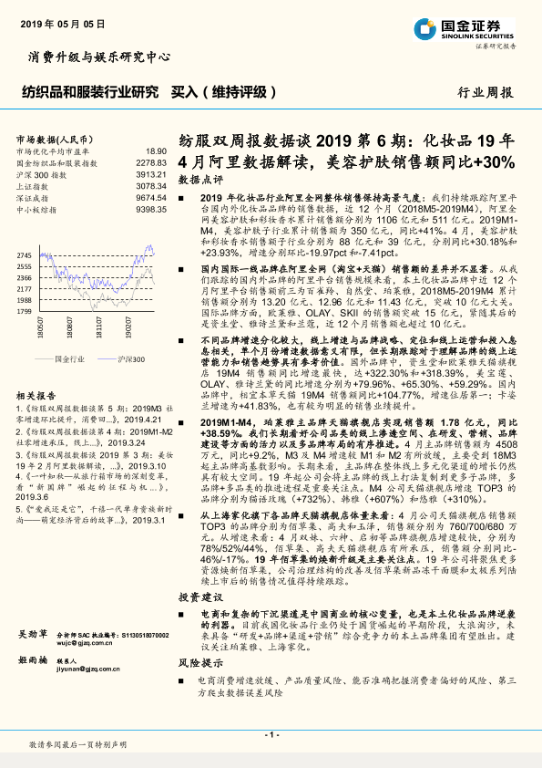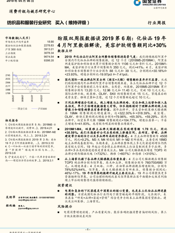 【国金证券】【20190505】纺服双周报数据谈2019第6期:化妆品19年4月阿里数据解读,美容护肤销售额同比+30%-12页