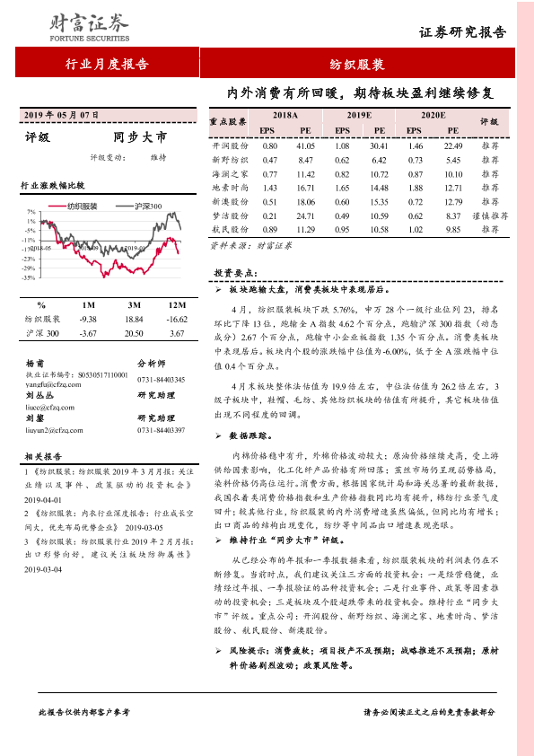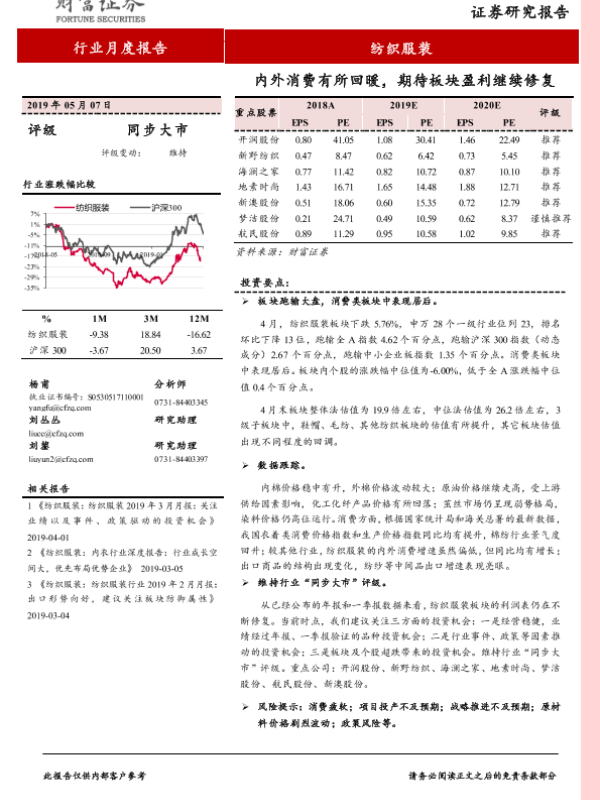 【财信证券】【20190507】20190507-财信证券-纺织服装行业月度报告:内外消费有所回暖,期待板块盈利继续修复-10页