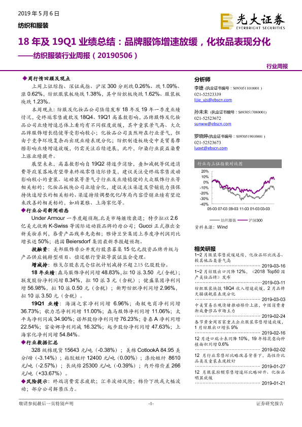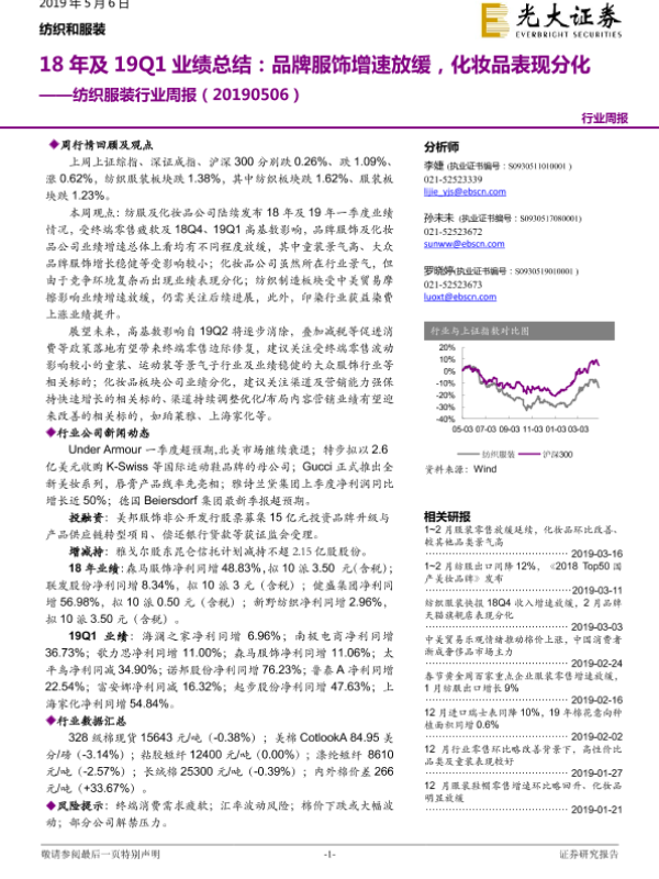 【光大证券】【20190506】20190506-光大证券-纺织服装行业周报:18年及19Q1业绩总结:品牌服饰增速放缓,化妆品表现分化-21页