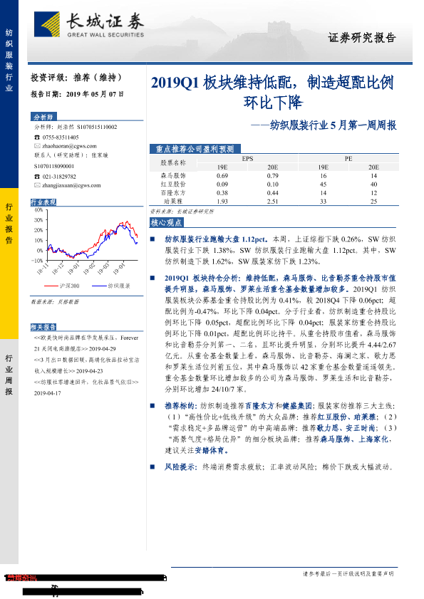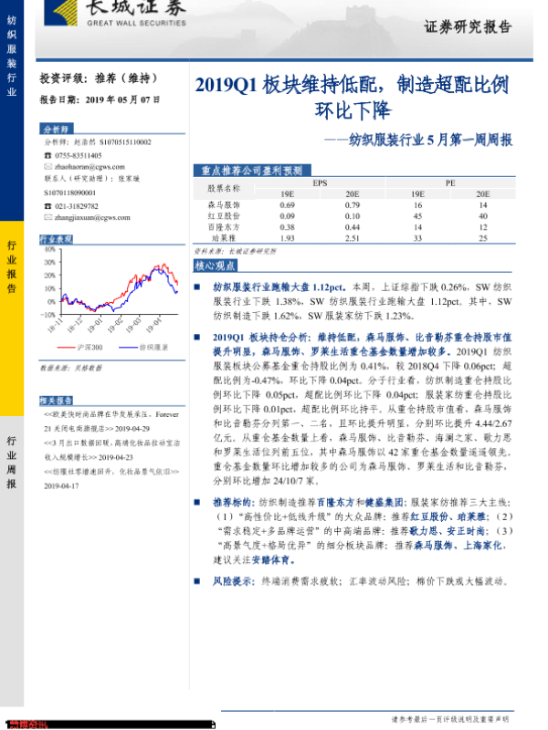【长城证券】【20190507】20190507-长城证券-纺织服装行业5月第一周周报:2019Q1板块维持低配,制造超配比例环比下降-22页