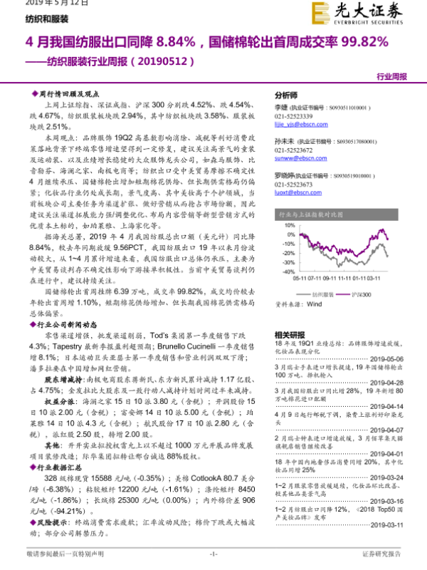【光大证券】【20190512】20190512-光大证券-纺织服装行业周报:4月我国纺服出口同降8.84%,国储棉轮出首周成交率99.82%-17页
