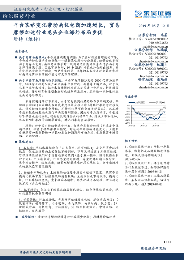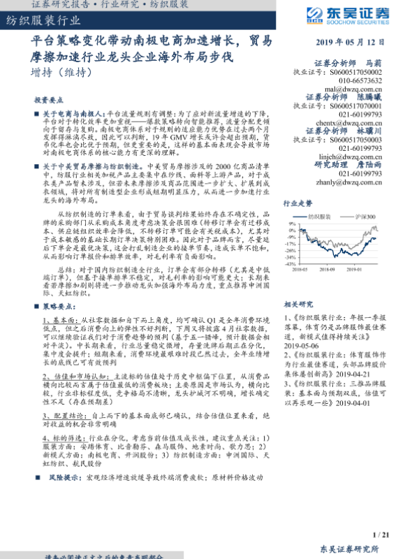 【东吴证券】【20190512】纺织服装行业跟踪周报:平台策略变化带动南极电商加速增长,贸易摩擦加速行业龙头企业海外布局步伐-21页