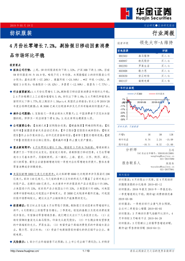 【华金证券】【20190519】20190519-华金证券-纺织服装行业周报:4月份社零增长7.2%,剔除假日移动因素消费品市场环比平稳-19页
