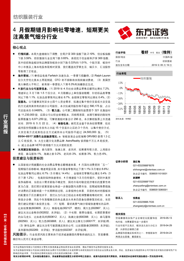 【东方证券】【20190519】20190519-东方证券-纺织服装行业周报:4月假期错月影响社零增速,短期更关注高景气细分行业-11页