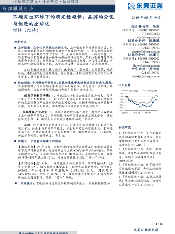 【东吴证券】【20190519】纺织服装行业:不确定性环境下的确定性趋势:品牌的分化与制造的全球化-22页