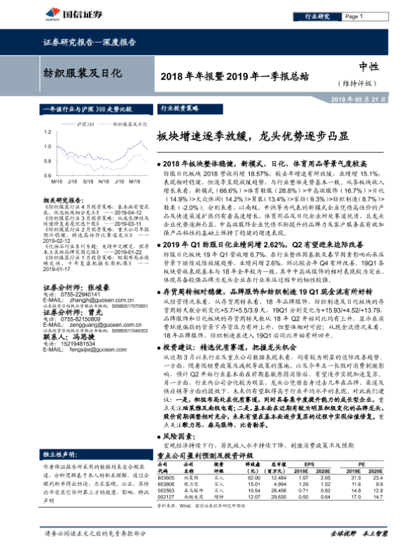 【国信证券】【20190521】纺织服装及日化2018年年报暨2019年一季报总结:板块增速逐季放缓,龙头优势逐步凸显-65页