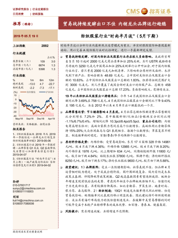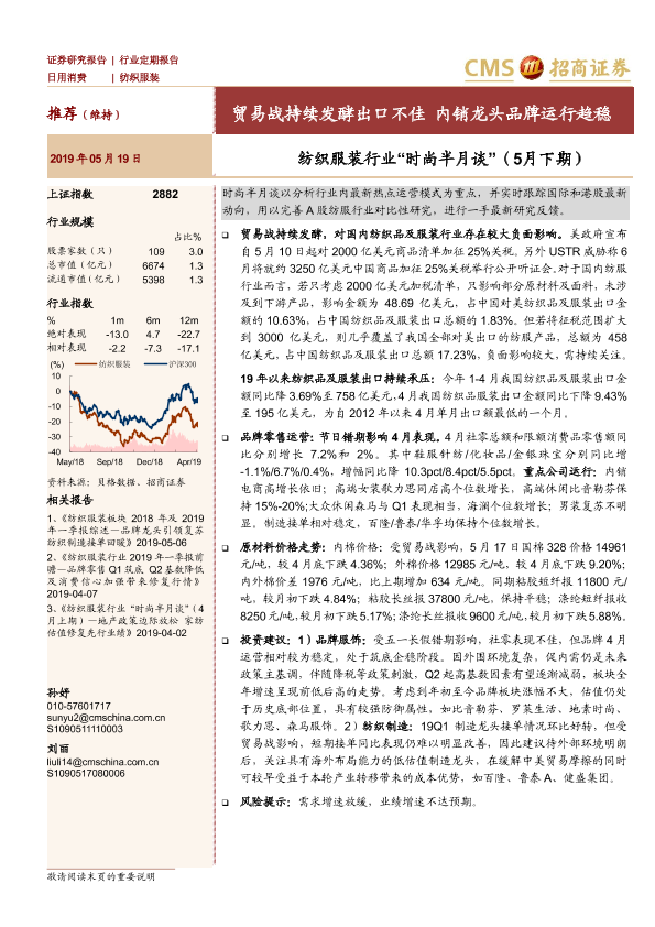 【海通证券】【20190519】纺织服装行业“时尚半月谈”(5月下期):贸易战持续发酵出口不佳 内销龙头品牌运行趋稳-27页