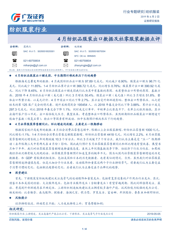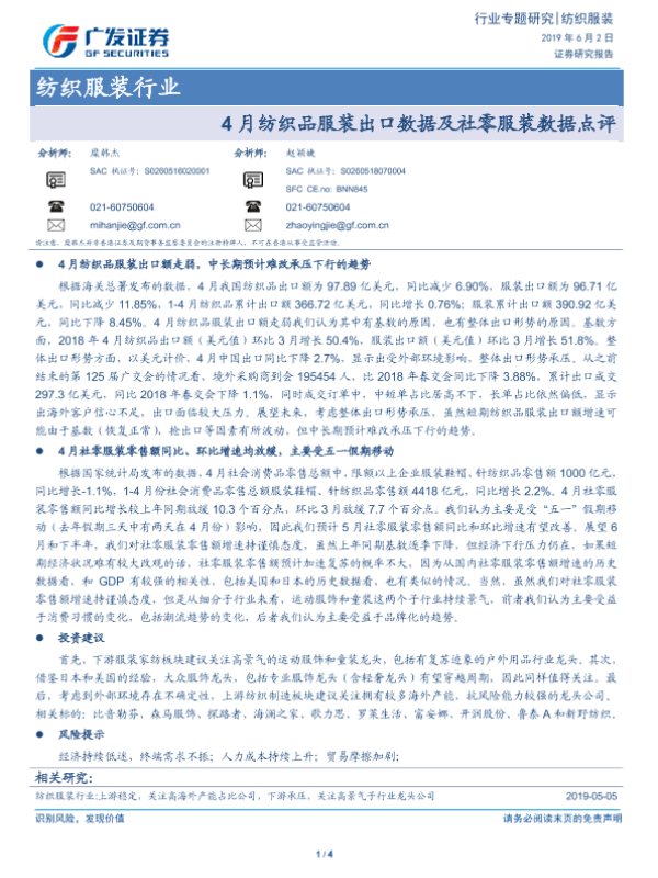 【广发证券】【20190602】4月纺织品服装出口数据及社零服装数据点评-4页