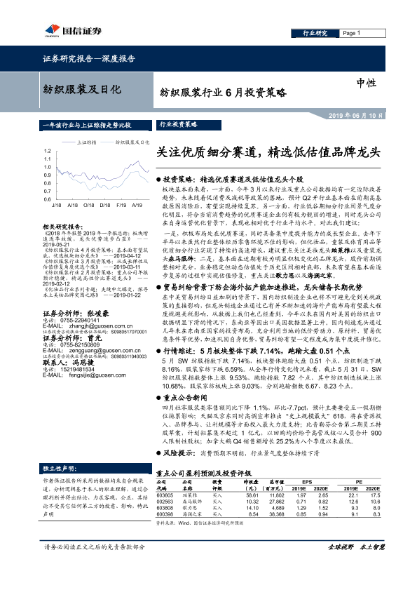 【国信证券】【20190610】20190610-国信证券-纺织服装行业6月投资策略:关注优质细分赛道,精选低估值品牌龙头-14页