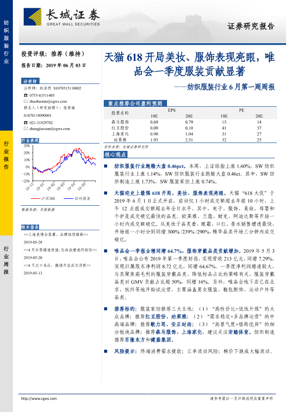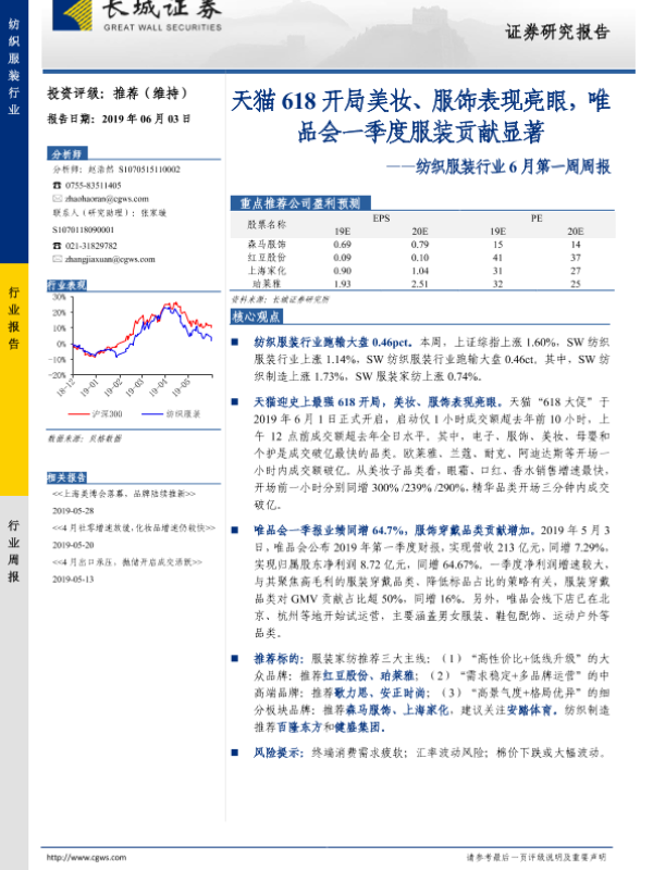 【长城证券】【20190603】20190603-长城证券-纺织服装行业6月第一周周报:天猫618开局美妆、服饰表现亮眼,唯品会一季度服装贡献显著-21页