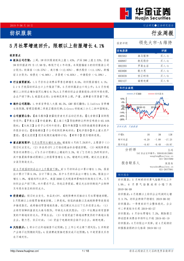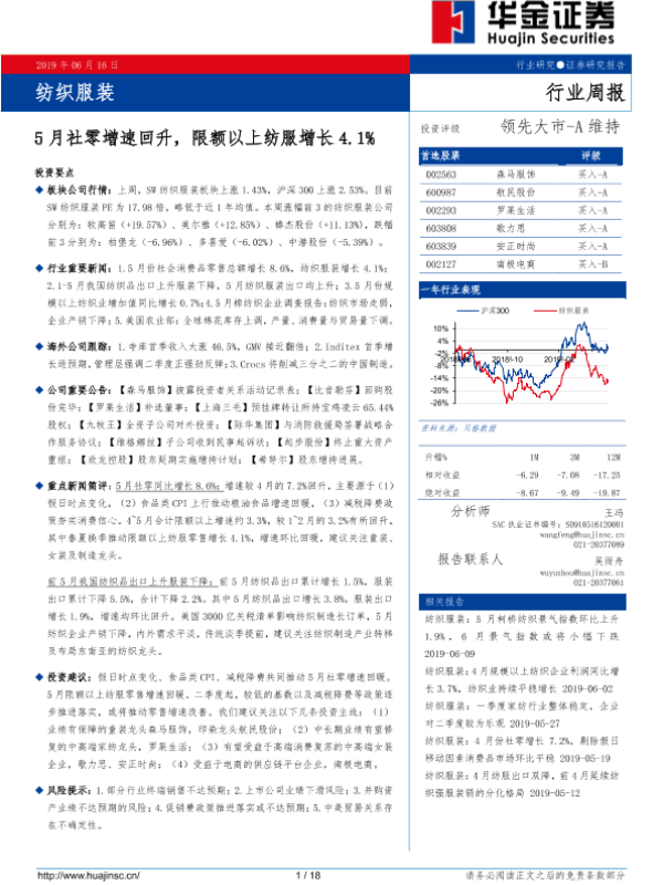【华金证券】【20190616】20190616-华金证券-纺织服装行业周报:5月社零增速回升,限额以上纺服增长4.1%-18页