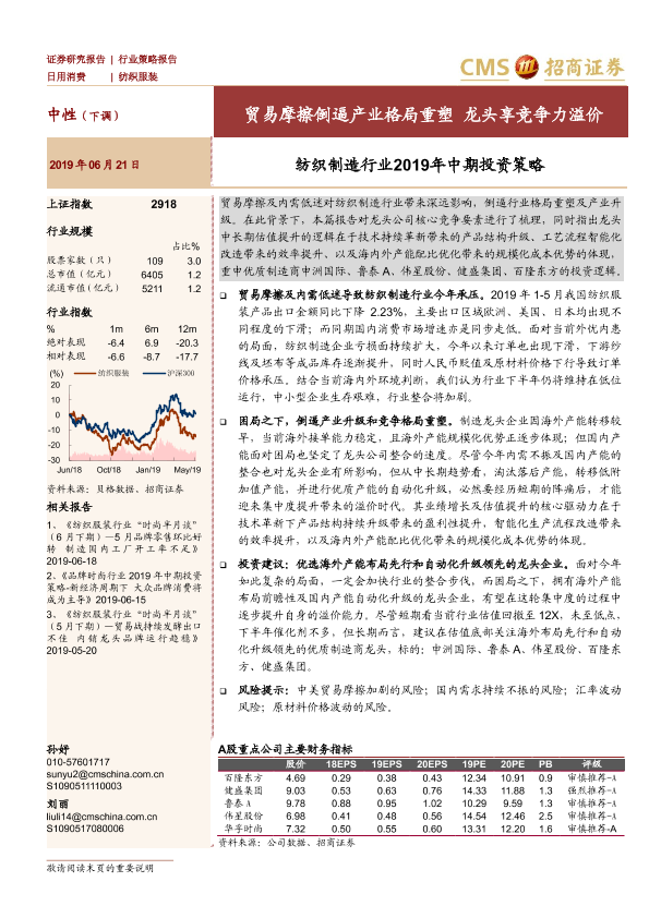 【海通证券】【20190621】纺织制造行业2019年中期投资策略:贸易摩擦倒逼产业格局重塑 龙头享竞争力溢价-17页