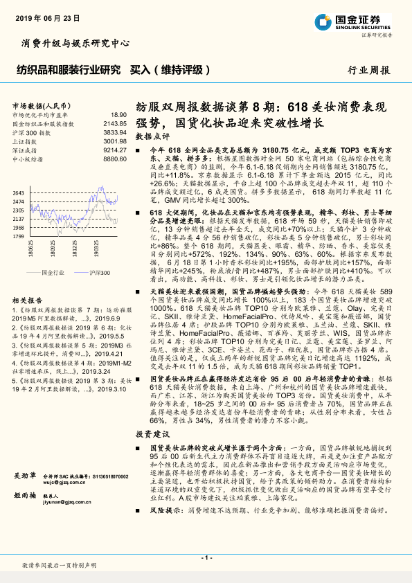 【国金证券】【20190623】纺服双周报数据谈第8期:618美妆消费表现强势,国货化妆品迎来突破性增长-9页
