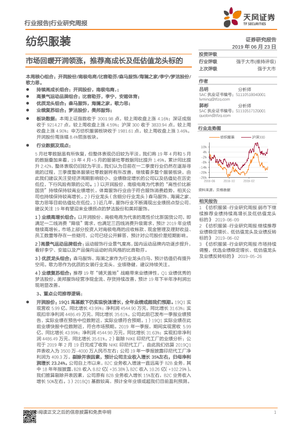 【天风证券】【20190623】20190623-天风证券-纺织服装行业研究周报:市场回暖开润领涨,推荐高成长及低估值龙头标的-16页