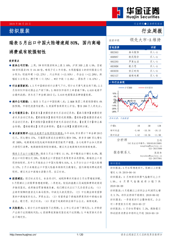 【华金证券】【20190623】20190623-华金证券-纺织服装行业周报:瑞表5月出口中国大陆增速超80%,国内高端消费或有较强韧性-20页