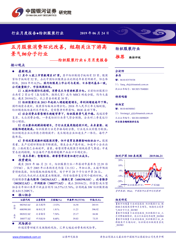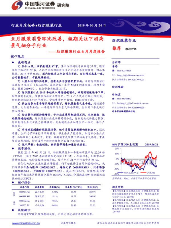 【银河证券】【20190624】20190624-中国银河-纺织服装行业6月月度报告:五月服装消费环比改善,短期关注下游高景气细分子行业-36页