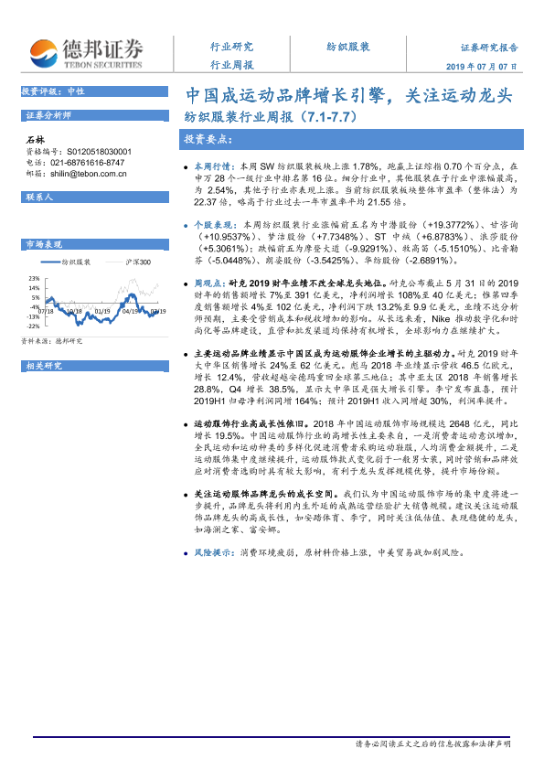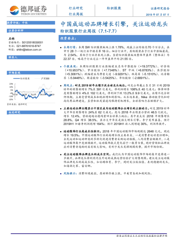 【德邦证券】【20190707】20190707-德邦证券-纺织服装行业周报:中国成运动品牌增长引擎,关注运动龙头-7页