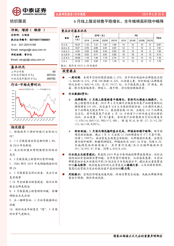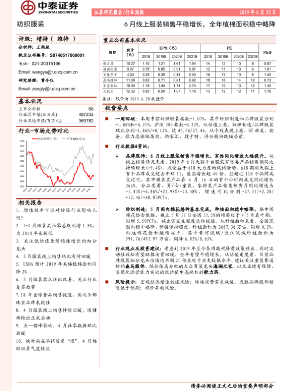 【中泰证券】【20190630】20190630-中泰证券-纺织服装行业周报:6月线上服装销售平稳增长,全年植棉面积稳中略降-14页