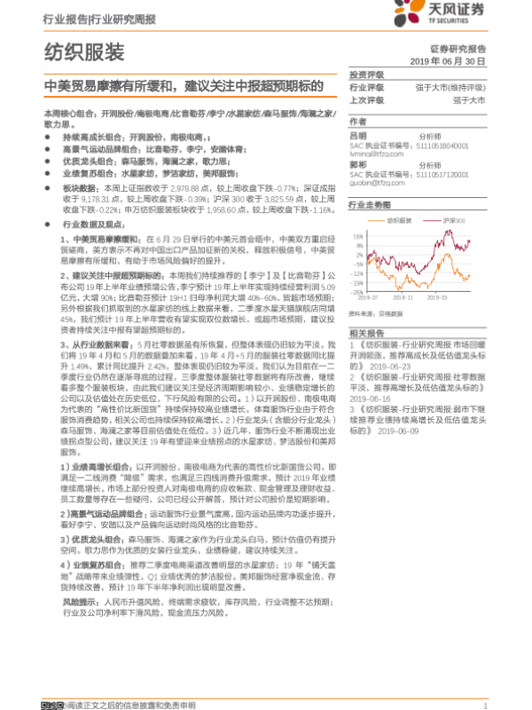 【天风证券】【20190630】20190630-天风证券-纺织服装行业研究周报:中美贸易摩擦有所缓和,建议关注中报超预期标的-20页
