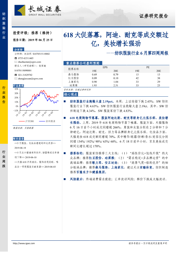 【长城证券】【20190625】纺织服装行业6月第四周周报:618大促落幕,阿迪、耐克等成交额过亿,美妆增长强劲-21页