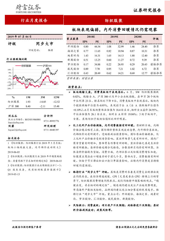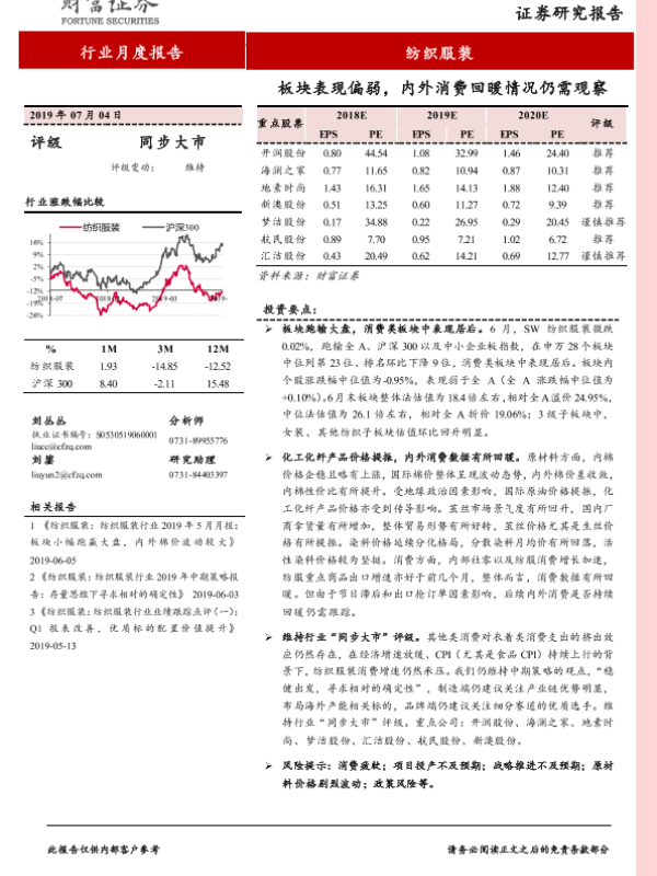 【财信证券】【20190704】纺织服装行业月度报告:板块表现偏弱,内外消费回暖情况仍需观察-10页