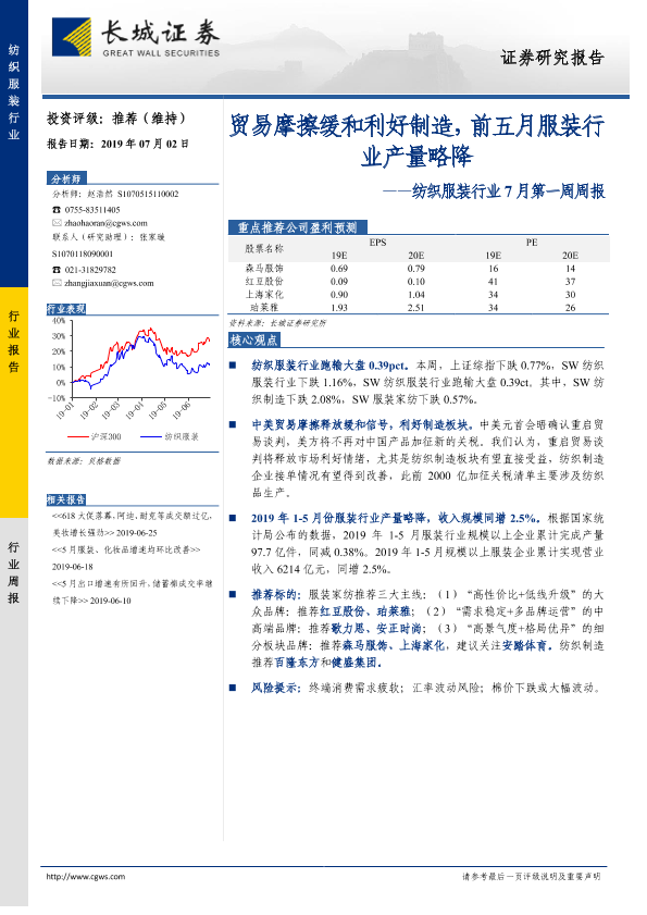 【长城证券】【20190702】20190702-长城证券-纺织服装行业7月第一周周报:贸易摩擦缓和利好制造,前五月服装行业产量略降-21页
