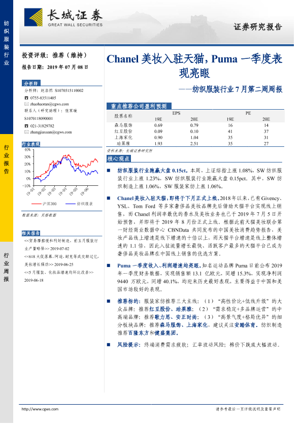 【长城证券】【20190708】20190708-长城证券-纺织服装行业7月第二周周报:Chanel美妆入驻天猫,Puma一季度表现亮眼-21页