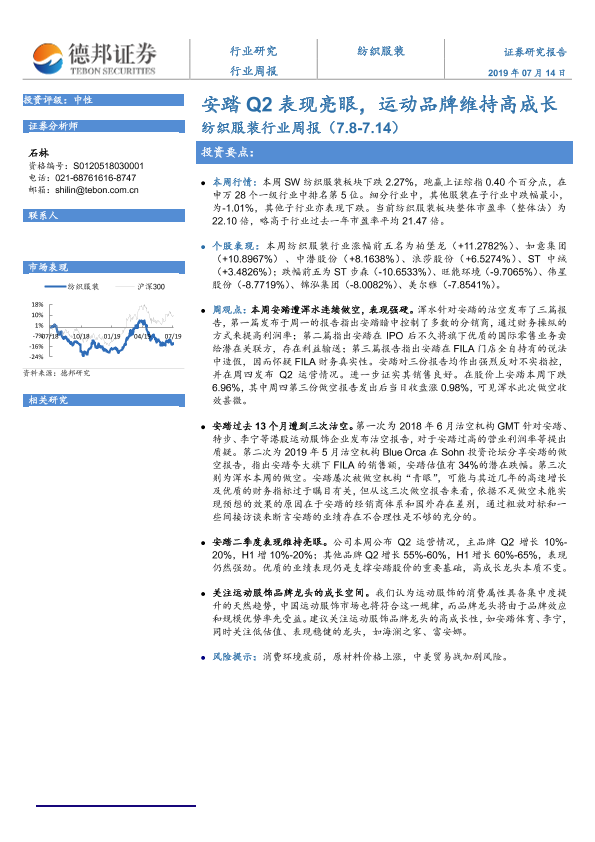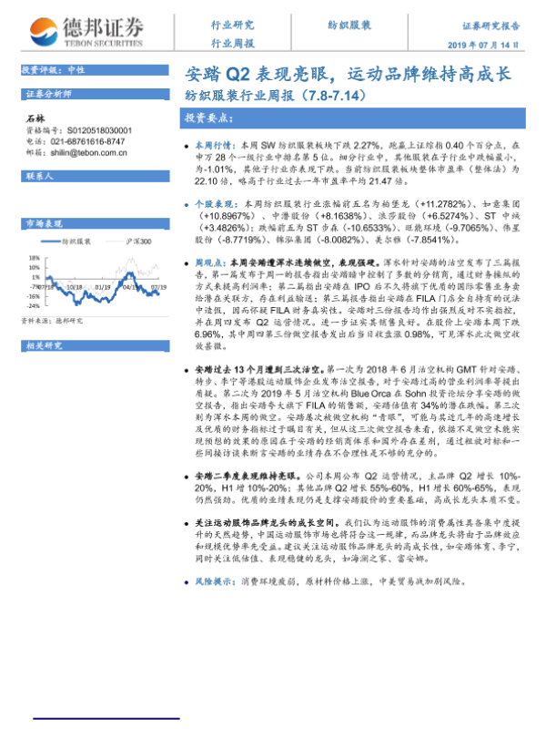 【德邦证券】【20190714】20190714-德邦证券-纺织服装行业周报:安踏Q2表现亮眼,运动品牌维持高成长-8页